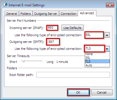 Enter port 993 as the Incoming server (IMAP) port and ensure that SSL is chosen from the Use the following type of encrypted connection drop-down box.